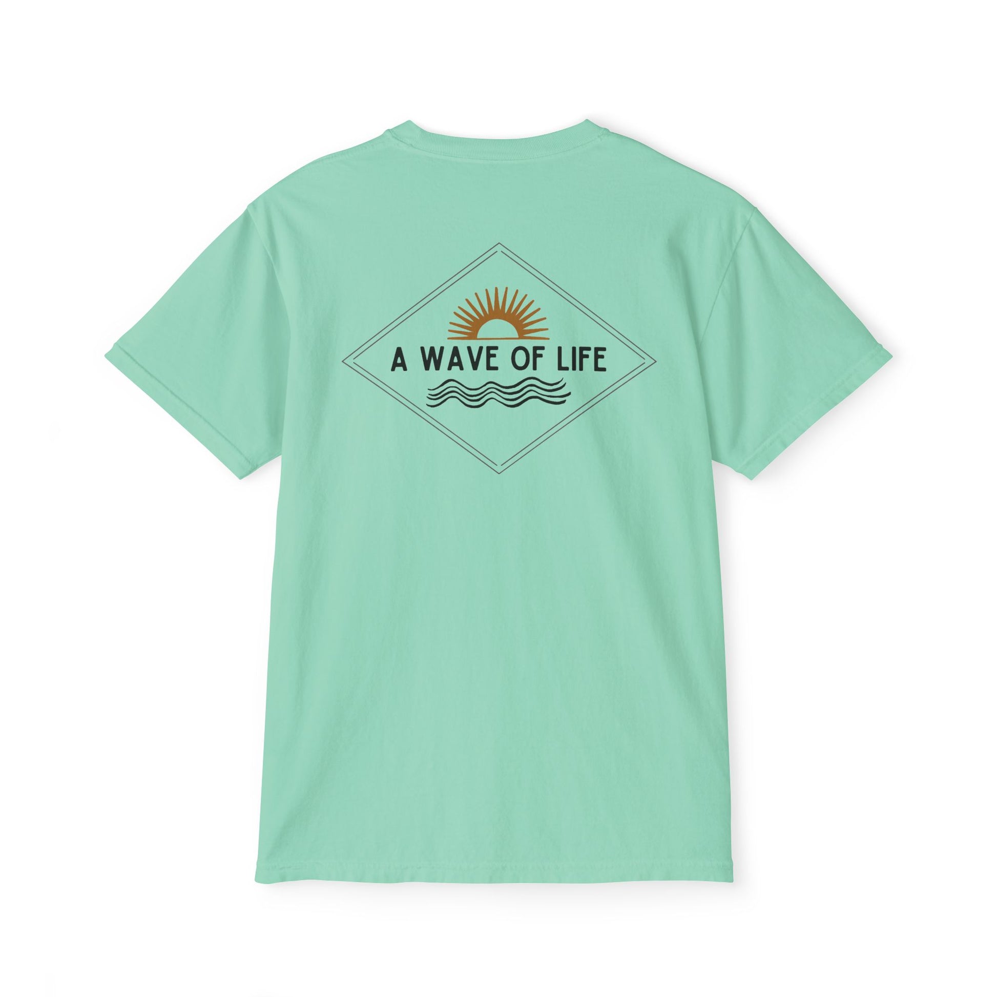 This A Wave of Life - Pocket T-Shirt is the perfect addition to your casual wardrobe. Made with 100% ring-spun cotton, it offers a comfortable and relaxed fit. The pigment dye colors provide a vintage look that will last for years to come. With a left chest pocket and unique DTF printed designs, this t-shirt is ideal for those who love a laid-back, beachy vibe. Perfect for casual wear, beach outings, and summer vacations.
